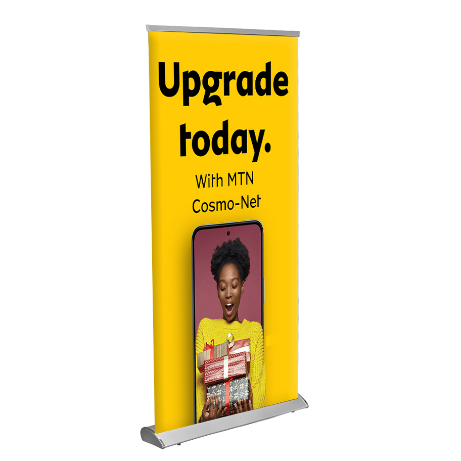 Pull Up Banner 1.2 x 2m, digitally printed onto PVC, Complete with Executive Chrome base